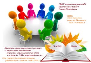 15 октября 2025 года на базе Государственного бюджетного общеобразовательного учреждения школы- интерната № 8 Пушкинского района Санкт-Петербурга прошел районный практико-ориентированный семинар на тему «Современная инклюзивная социально-образовательная среда для детей с ОВЗ в начальной школе».