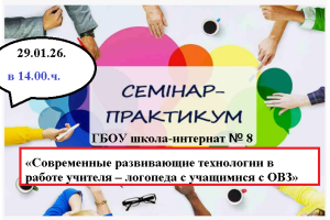 29 января 2026 года в 14.00. на базе Государственного бюджетного общеобразовательного учреждения школы- интерната № 8 Пушкинского района Санкт-Петербурга прошел районный практико-ориентированный семинар на тему «Современные развивающие технологии в работе учителя – логопеда с учащимися с ОВЗ».